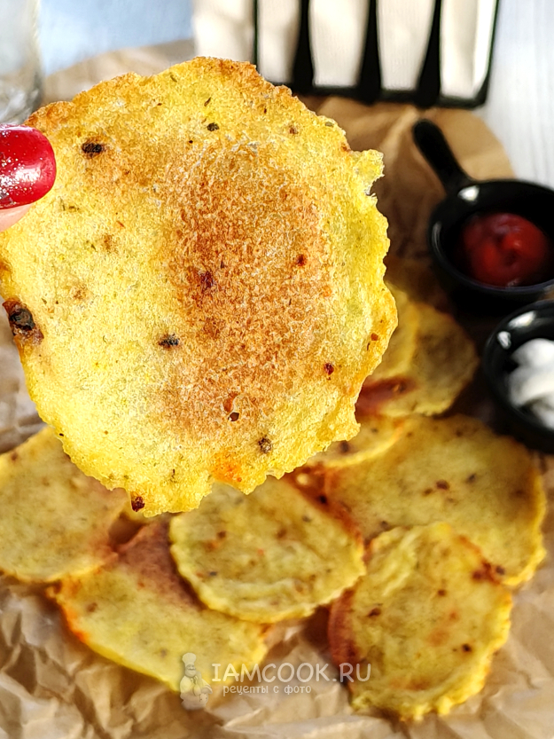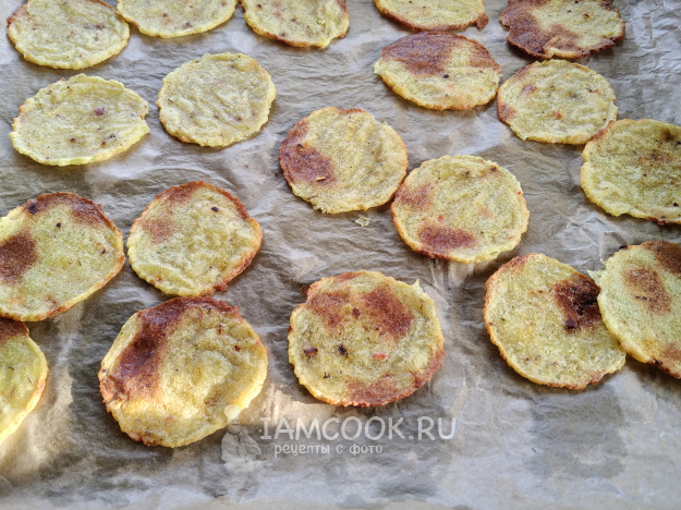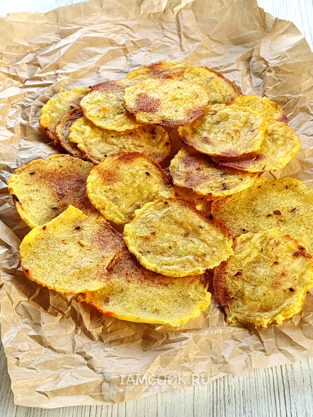 Чипсы из картофельного пюре сушить в духовке с режимом "конвекция" при 150 градусах, пока не высохнут. Если чипсы сильно подрумяниваются, но еще мягкие, надо уменьшить температуру.