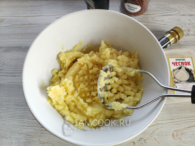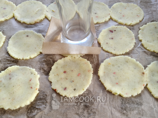 Небольшой кусочек пергамента положить на картофель и придавить любым стаканом, чтобы получилась круглая тонкая лепешка.