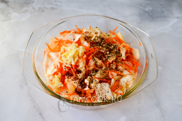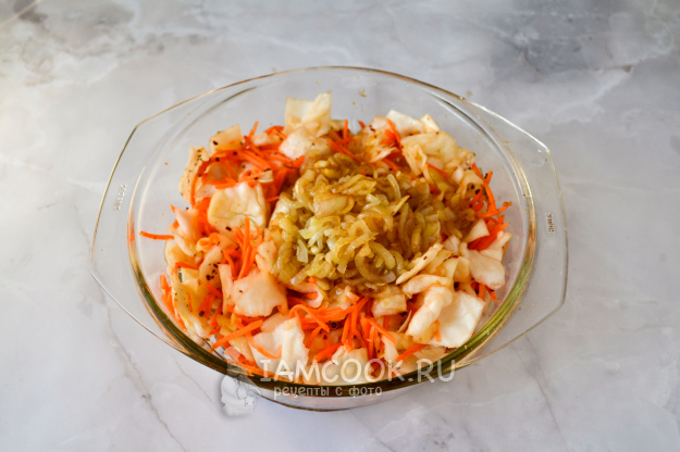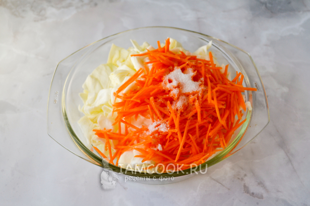 В миску положите нарезанную капусту и морковь. Добавьте сахар и соль. Руками перемешайте и слегка помните овощи, чтобы стали мягче и дали сок.