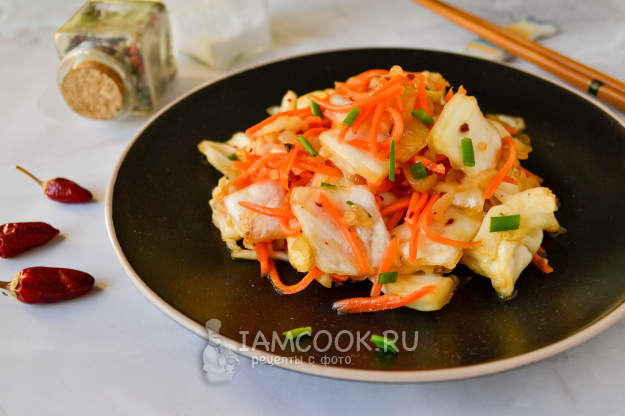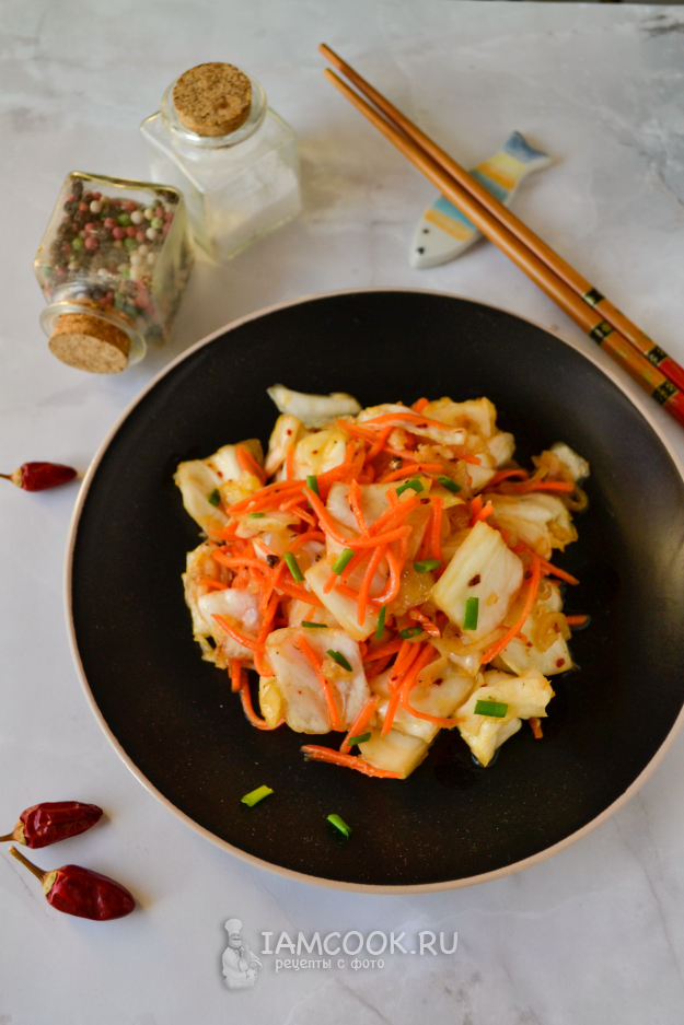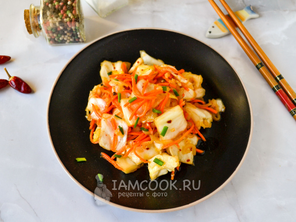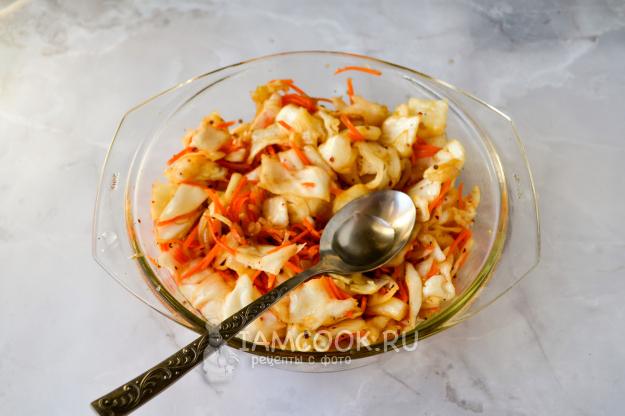 Влейте уксус. Перемешайте. Капуста по-корейски квадратиками готова. Но чтобы насладиться вкусом в полном объеме, дайте салату настояться хотя бы 1 час в холодильнике.