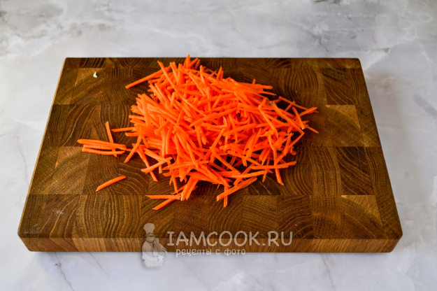 Морковь натрите на крупной терке или терке для корейских салатов.