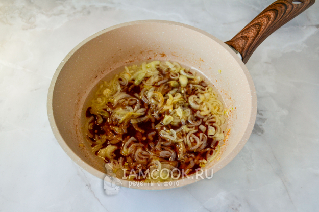Аккуратно влейте в сковороду соевый соус. Прогрейте 1 минуту.