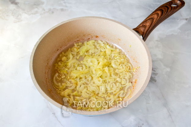 Лук нарежьте полукольцами и обжарьте на сильном огне, помешивая, 3-4 минуты.