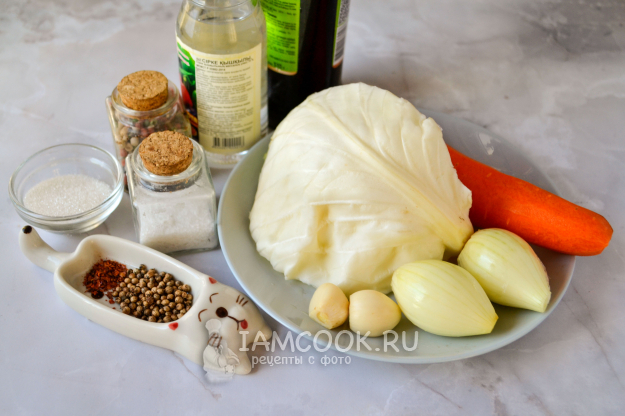 Соберите продукты для приготовления капусты по-корейски квадратиками. Капусту очистите от верхних жестких листьев, морковь, лук и чеснок очистите и вымойте.