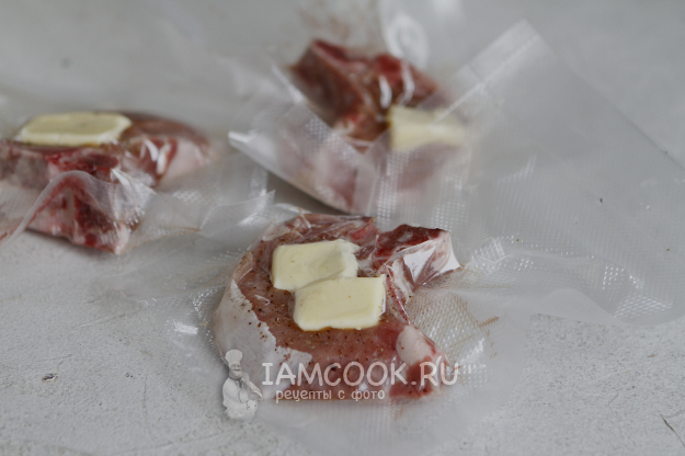 Разложите корейку с кусочком масла по пакетам, лучше по отдельности. Завакуумируйте пакеты. Для свиной корейки су-вид рецепт можно изменять под свои вкусы: добавить тимьян, свежий чеснок, смесь любимых трав.