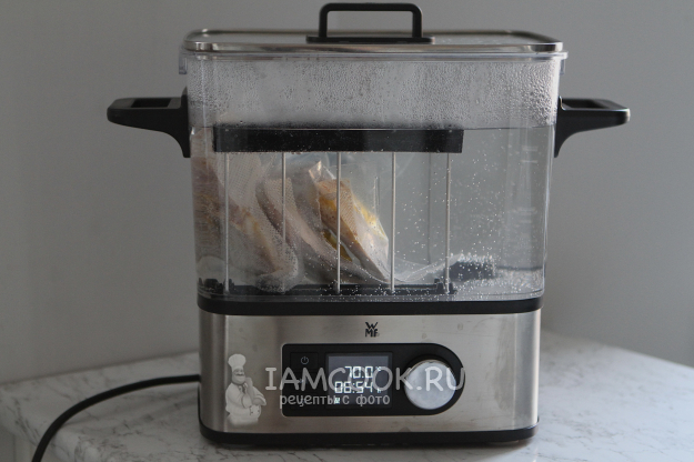 Нагрейте воду до температуры 70 градусов. Когда вода нагреется до нужной температуры, опустите пакеты с корейкой и готовьте 7 часов.