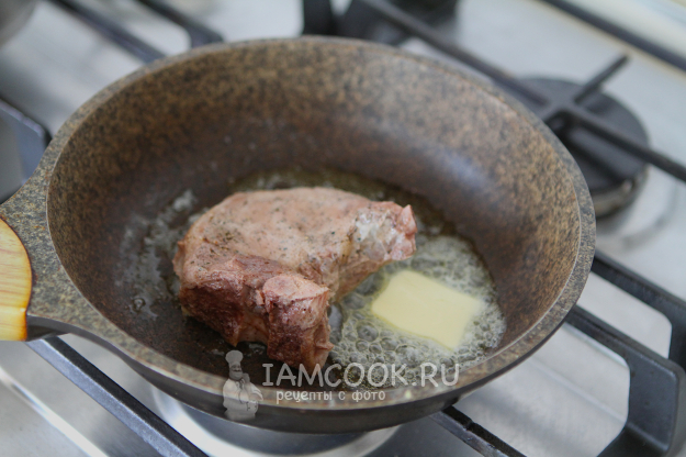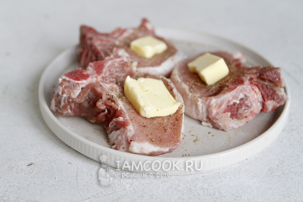 Сливочное масло нарежьте на небольшие кусочки и уложите на корейку.