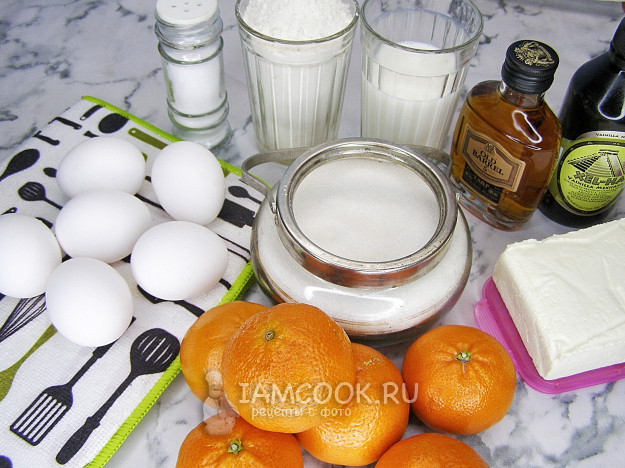 Соберём продукты для приготовления бисквитного рулета с мандаринами. Масло и яйца желательно заранее достать из холодильника, чтобы они прогрелись до комнатной температуры. Ванильный экстракт можно заменить на щепотку ванилина или на 1 чайную ложку ванильного сахара.