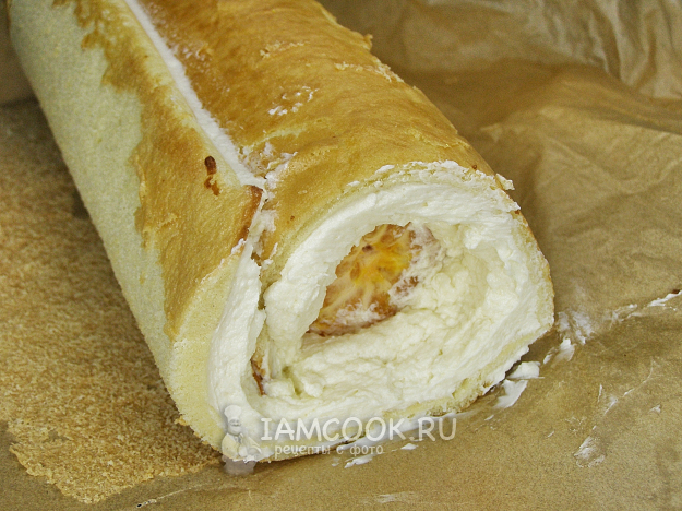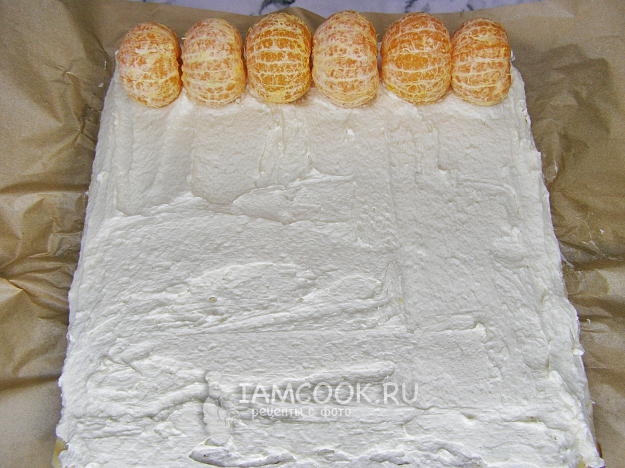 Сворачиваем тесто в рулет, начиная с края с мандаринами. Снова заворачиваем в бумагу и убираем в холодильник минут на 30, чтобы крем застыл.
