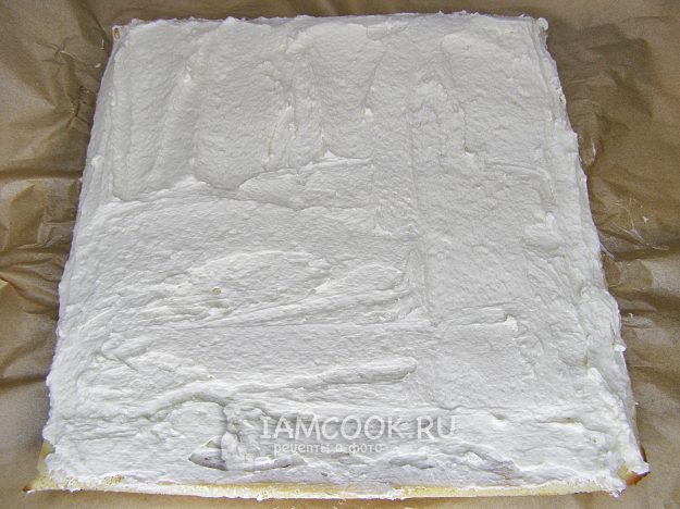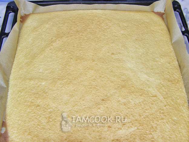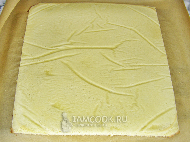 Горячее тесто сворачиваем в рулет вместе с бумагой и оставляем в таком виде остывать.