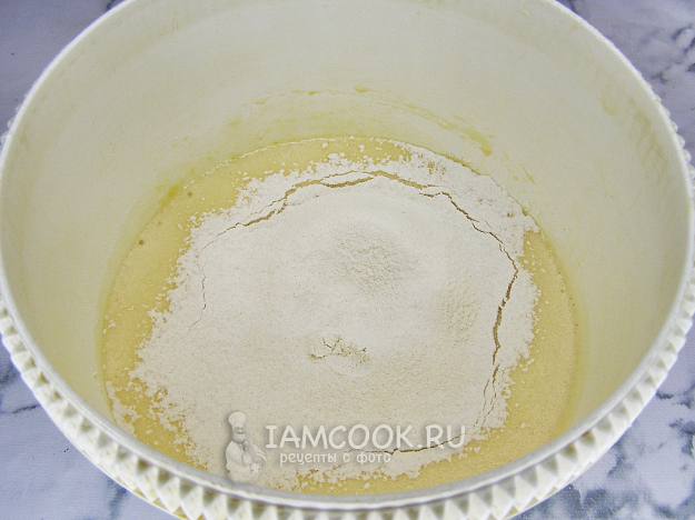 Частями всыпаем просеянную муку и перемешиваем тесто лопаткой или ложкой. Тесто должно получиться достаточно жидким.