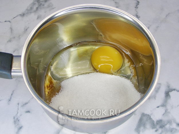 Теперь займёмся приготовлением крема. В сотейник с толстым дном разбиваем яйцо, добавляем сахар, щепотку соли и ванильный экстракт. Хорошо перемешиваем.