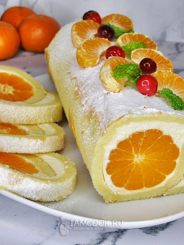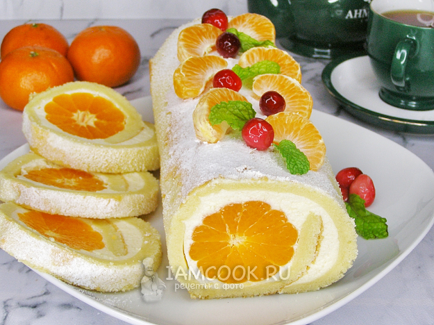 Остывший бисквитный рулет с мандаринами можно посыпать сахарной пудрой и украсить на свой вкус. Приятного аппетита!
