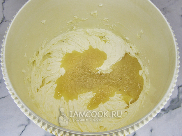 Понемногу добавляем в масло яично-молочный крем и продолжаем взбивать.