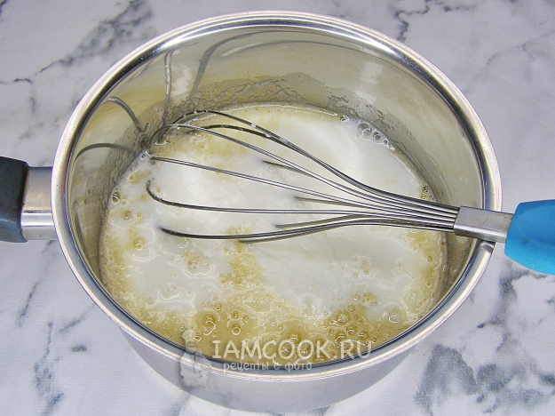 Вливаем молоко, ещё раз перемешиваем и ставим на огонь чуть ниже среднего. Варим, постоянно перемешивая венчиком, примерно 10 минут, пока крем слегка не загустеет.