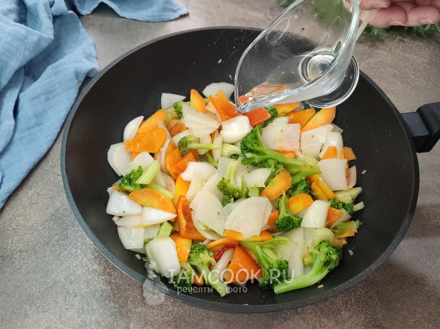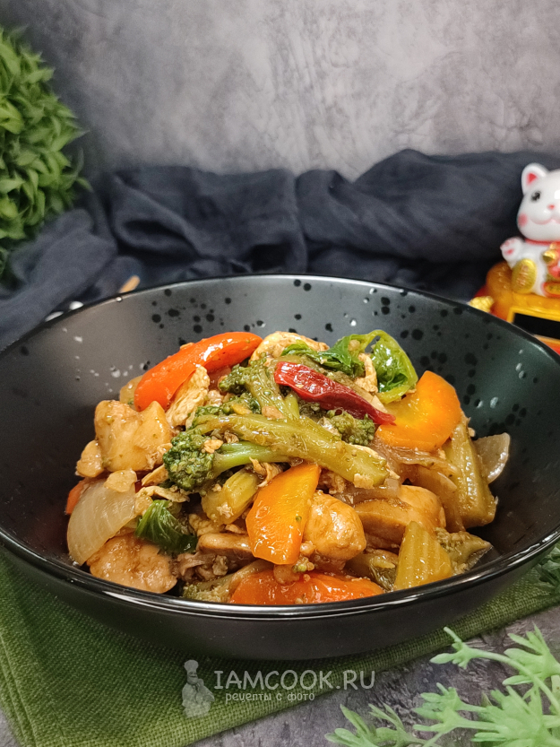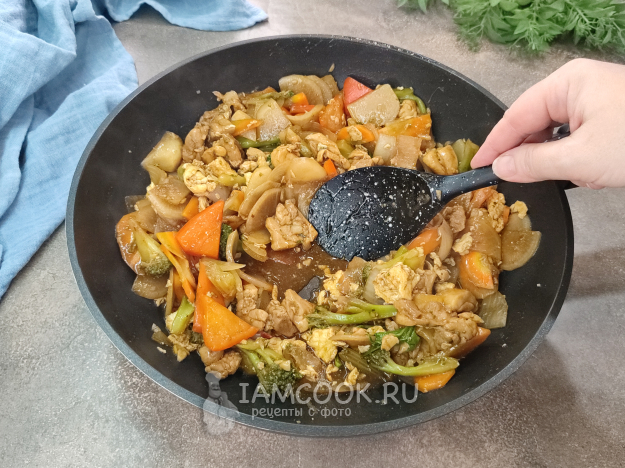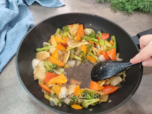 Чтобы овощи немного пропарились, влейте воду, готовьте еще пару минут. Вообще, в азиатской кухне приветствуется, когда овощи приготовлены не до конца (аль-денте, так сказать 😁).