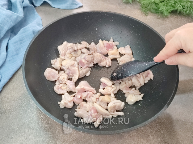 В той же сковороде обжарьте, часто помешивая, курицу до готовности.