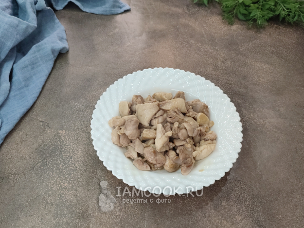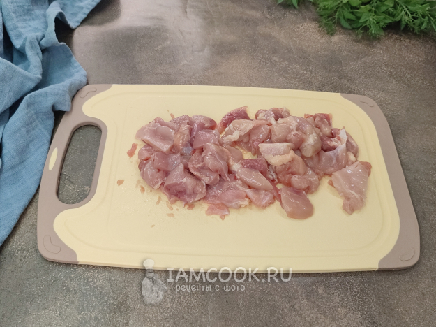 Филе бедра нарежьте кусочками, соизмеримыми с овощными.