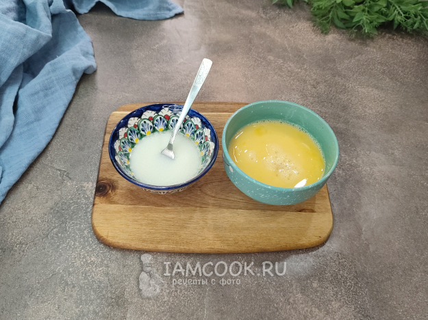 Крахмал растворите в холодной воде, яйца хорошо взболтайте.