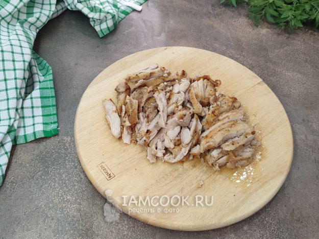 Курица немного остыла, ее режем ломтиками или соломкой, добавляем в сковороду.