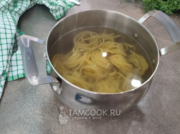 Пасту отварите согласно инструкции на упаковке до состояния аль-денте. После откиньте на сито, дайте стечь лишней воде. Промывать не надо.