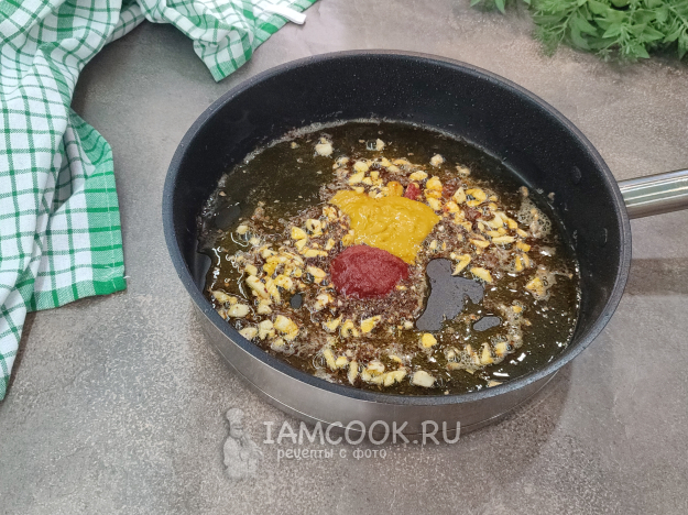 Добавим томатную пасту, горчицу. Чтобы собрать все вкусы воедино, влейте воду.