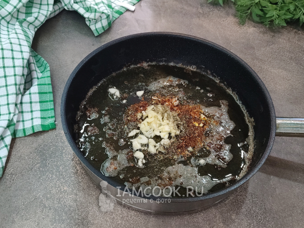Курицу вынимаем, а в эту же сковороду, где остались вкусные прижарки, добавляем чеснок, чили и сушеные травы, обжарим на слабом огне около минуты, помешивая.