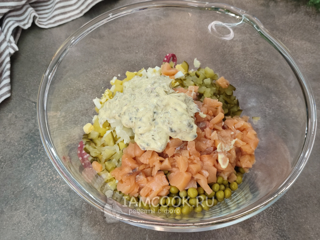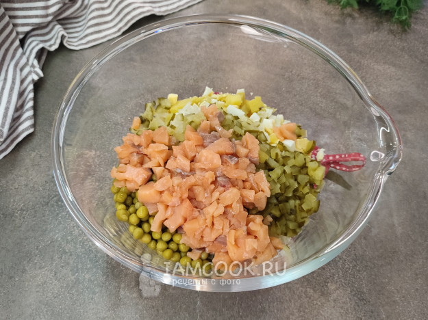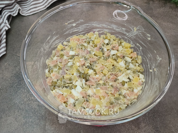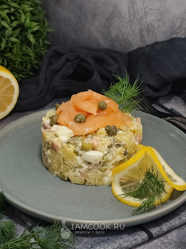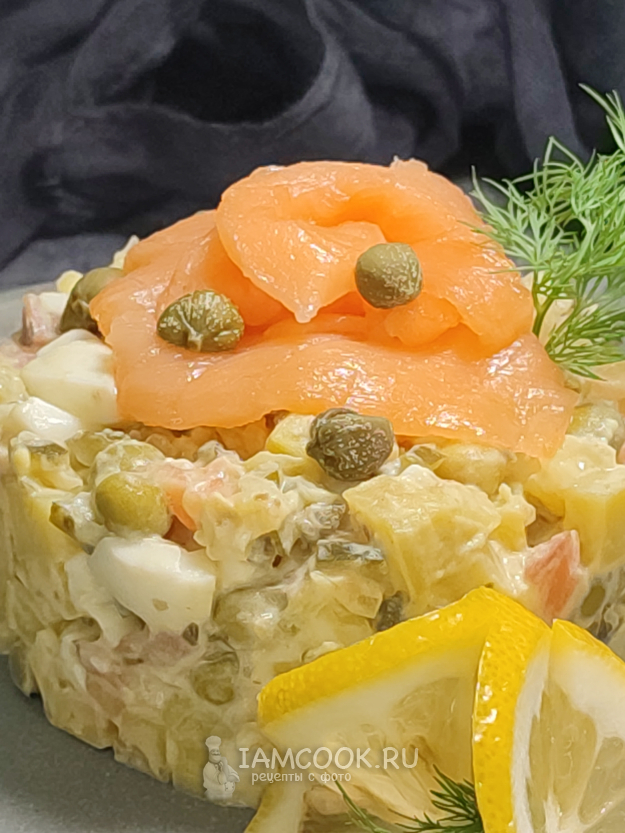 Салат Оливье с красной рыбой и каперсами готов. Даём ему охладиться пару часов и подаем к столу!
