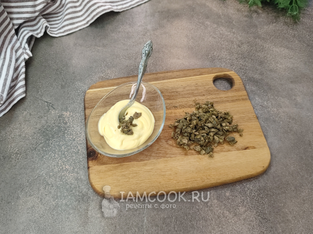 Чтобы каперсы равномерно "разошлись" в салате, рубим их помельче, смешиваем с майонезом.