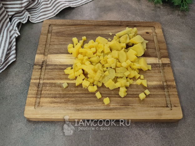 Все овощи, яйца, рыбу нарежем небольшим кубиком, размером с горошину.