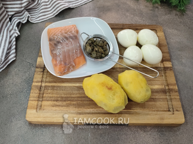 Овощи, яйца необходимо очистить, у рыбы удаляем кожу, проверяем на наличие костей. Если у вас каперсы в соли, как у меня, их промываем, если в маринаде - оставляем как есть.