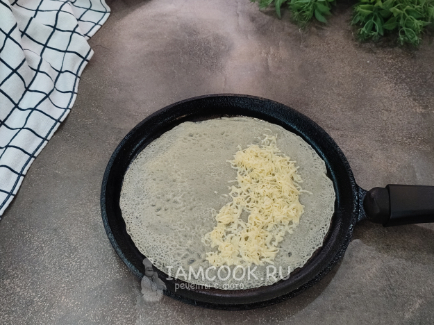 Когда краешки теста начнут "отходить" от сковороды, переворачиваем будущий кутаб на другую сторону. На одну половину выкладываем небольшое количество начинки.