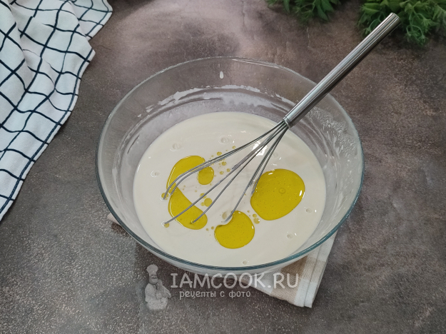 Вливайте воду постепенно, вам может понадобиться ее чуть больше или меньше. Тесто должно получиться жидким, по консистенции - как блинное. В конце добавьте масло, перемешайте.