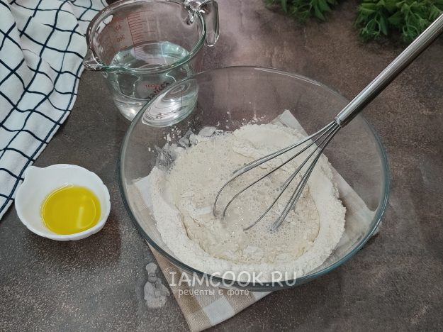 В миску всыпьте муку, соль, постепенно вливайте воду, перемешивая венчиком.