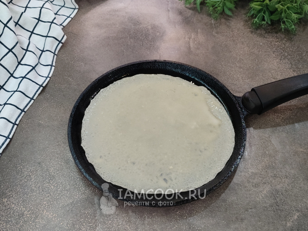 Процесс выпекания кутабов без раскатки очень схож с выпеканием наших блинчиков. Смазываем сковороду небольшим количеством масла перед приготовлением первого кутаба, выливаем в середину сковороды примерно один половник теста, поворачивая сковороду, даем тесту растечься. Всё как и с блинчиками. Выпекаем на среднем огне (7 из 9) сначала с одной стороны.