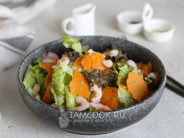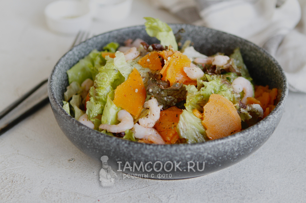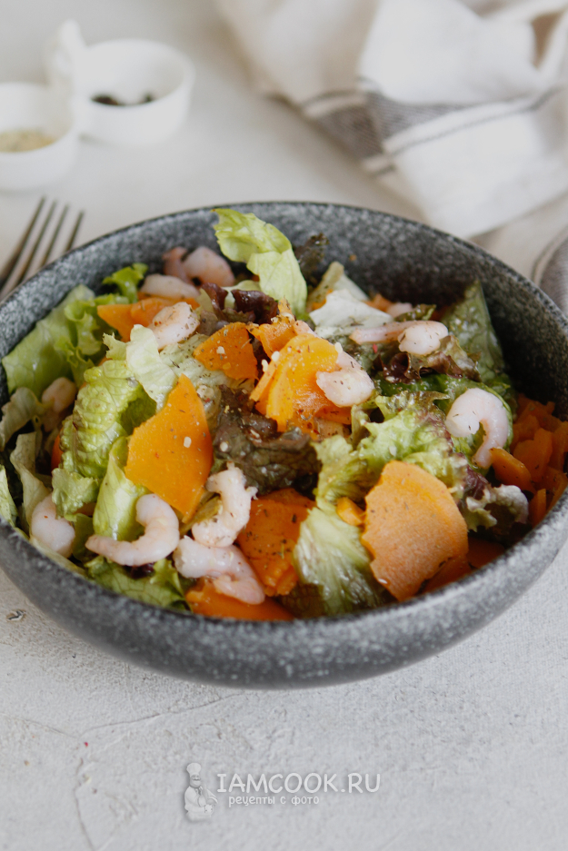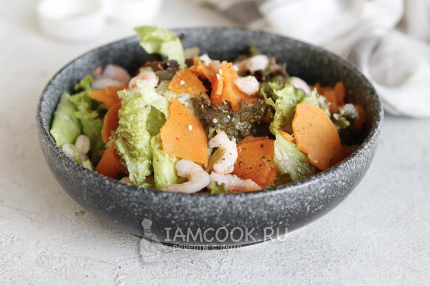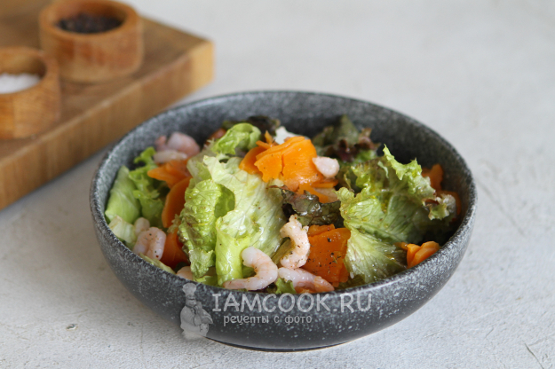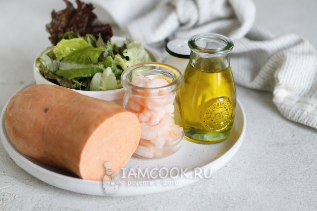 Соберите ингредиенты для приготовления салата с бататом и креветками. Креветки для салата подойдут любые: можно свежие, тогда их нужно будет просто обжарить на сливочном масле или в рассоле.