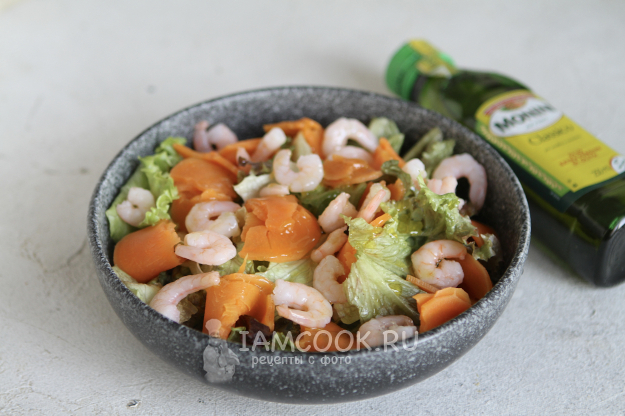 С креветок слейте рассол и уложите их рядом. Слегка посолите, можно добавить любимых трав, и сбрызните салат оливковым маслом.