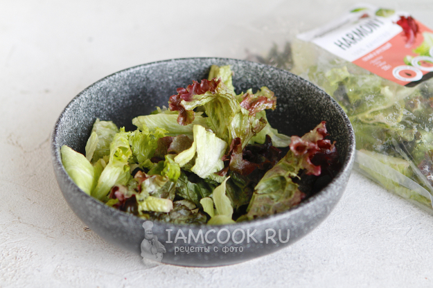 Зелень, точнее листья салатные, можно взять любые. В магазине я покупаю зелень в пакетах. Она уже подготовлена, мыть ее не нужно, что очень удобно. Если у вас салатные листья с рынка, обязательно промойте их под проточной водой и высушите на бумажном полотенце.