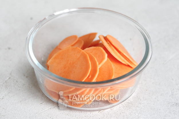 Подготовкой займемся с батата. Его дольками можно запечь в духовке или аэрогриле, приготовить на пару в мультиварке или обжарить на сливочном масле на сковороде. Почистите батат, нарежьте небольшими дольками. Слегка сбрызните маслом и отправьте в духовку. Запекайте 20-25 минут при 190 градусах, до мягкости. Приготовление в мультиварке займет у вас примерно 30 минут.