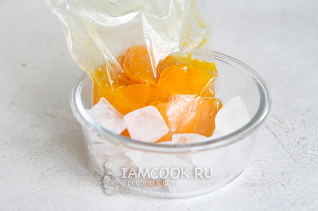 Готовила 1 час 30 минут при температуре 85 градусов. По готовности переложила батат в холодную воду со льдом и полностью его остудила. А затем убрала в холодильник, не вскрывая пакет. А когда собралась готовить салат, достала батат из холодильника и быстро собрала салат.