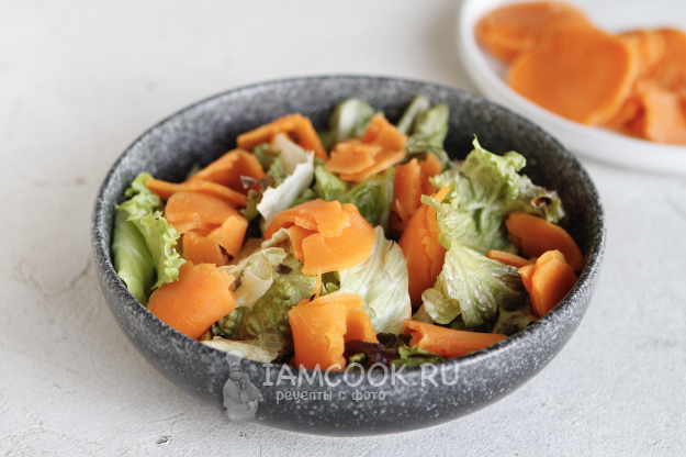 В последнее время я все чаще готовлю блюда в су-вид, и овощи в том числе. Для салата я заранее приготовила батат методом су-вид. В этом рецепте подробно об этом рассказывала.