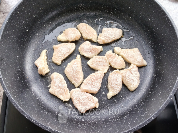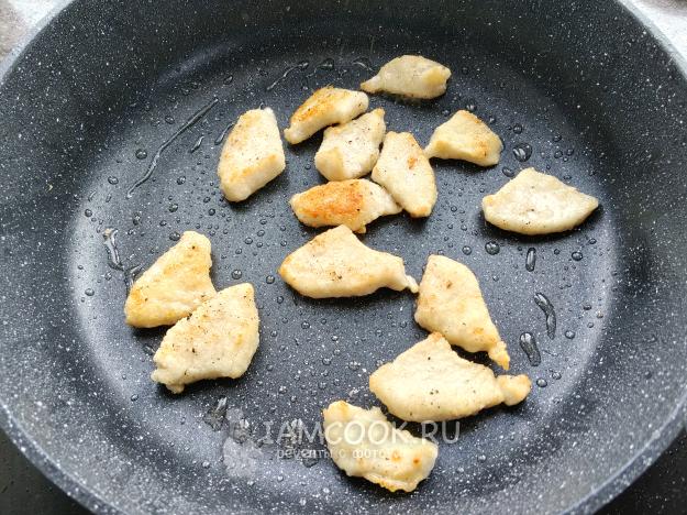 Филе курицы нарезать небольшими кусочками.