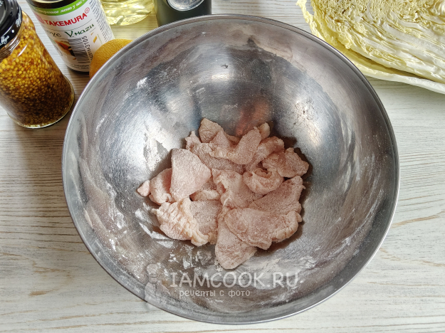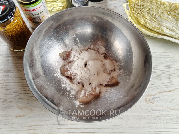 Перемешать, чтобы все кусочки покрылись им.