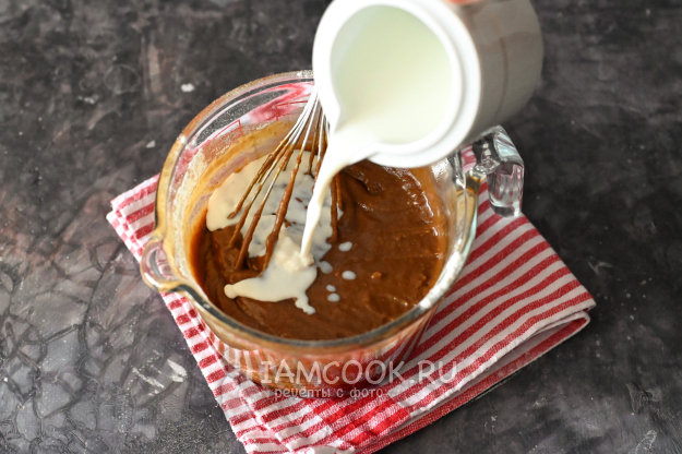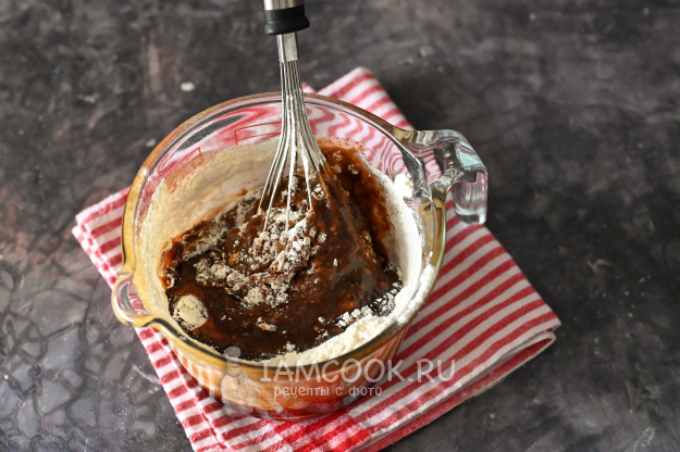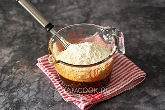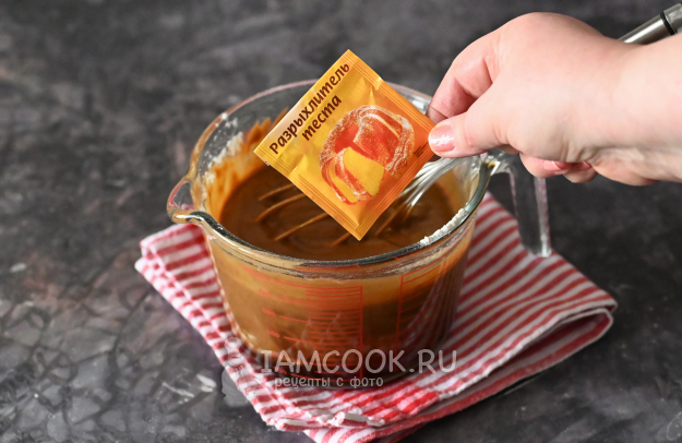 Тесто вымесите венчиком до гладкости и добавьте разрыхлитель. Вмешайте разрыхлитель в тесто.