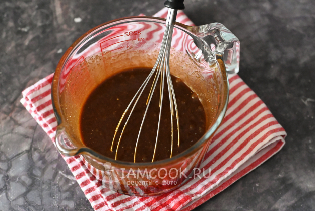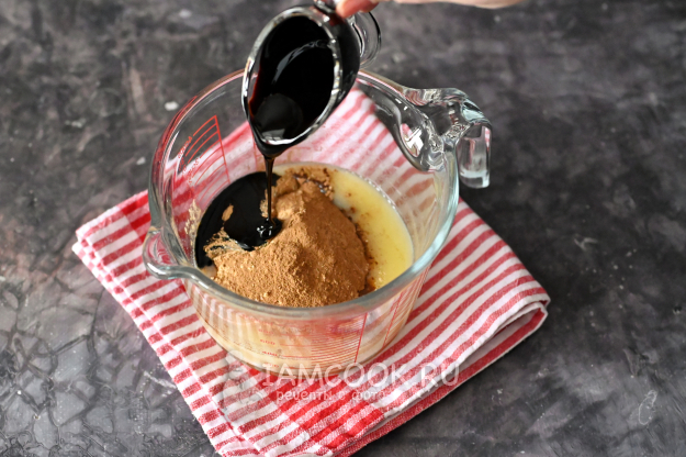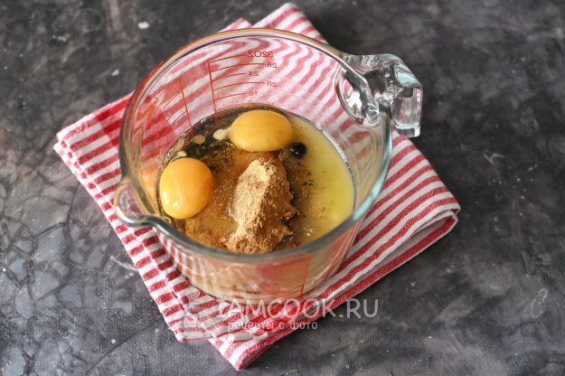 К растопленному маслу добавьте сахар, соль, имбирь, корицу и влейте мелассу.