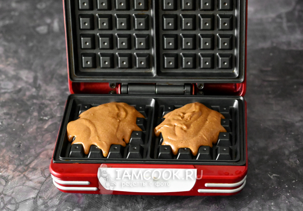 Налейте в ячейки вафельницы тесто, примерно 1-2 столовых ложки (в зависимости от размера вашей вафельницы).