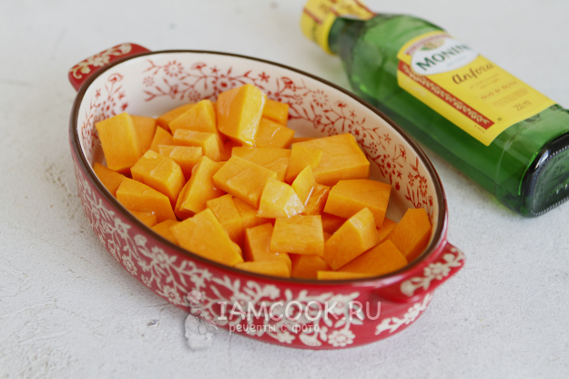 Почистите тыкву и нарежьте ее на квадратики. Переложите в форму для запекания и сбрызните оливковым маслом (1 ст. л.). Запекайте в разогретой духовке при 200 градусах 20 минут.