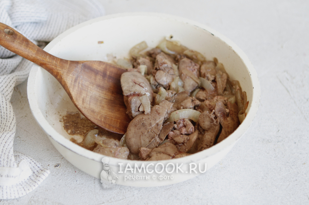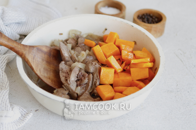 Кусочки печеной тыквы переложите в сковороду, добавьте специи по вкусу. Потушите ее вместе с печенкой на самом медленном огне под крышкой 10 минут.