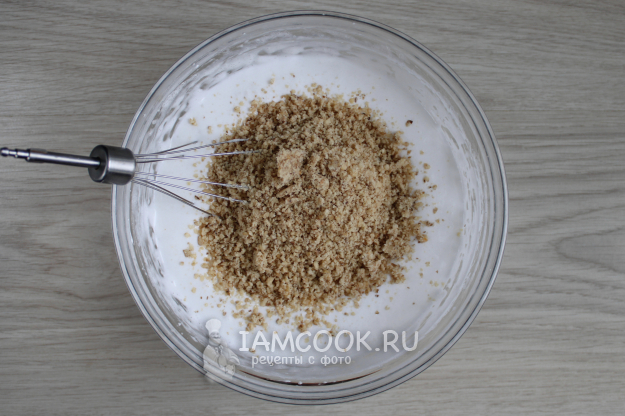 Взбейте белки с сахаром до их плотного глянцевого состояния. Затем вмешайте измельченные грецкие орехи.
