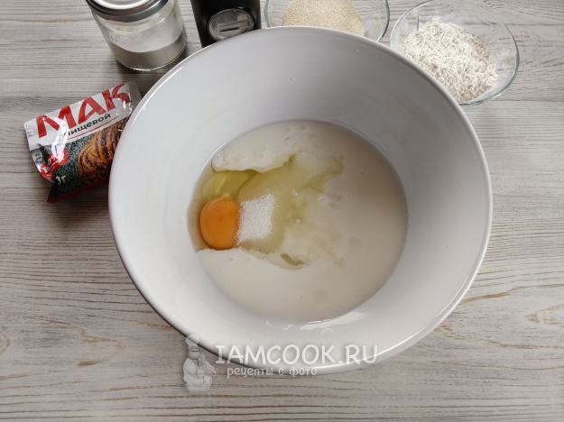 Жидкие ингредиенты собрать в одной емкости, добавить соль и сахар.